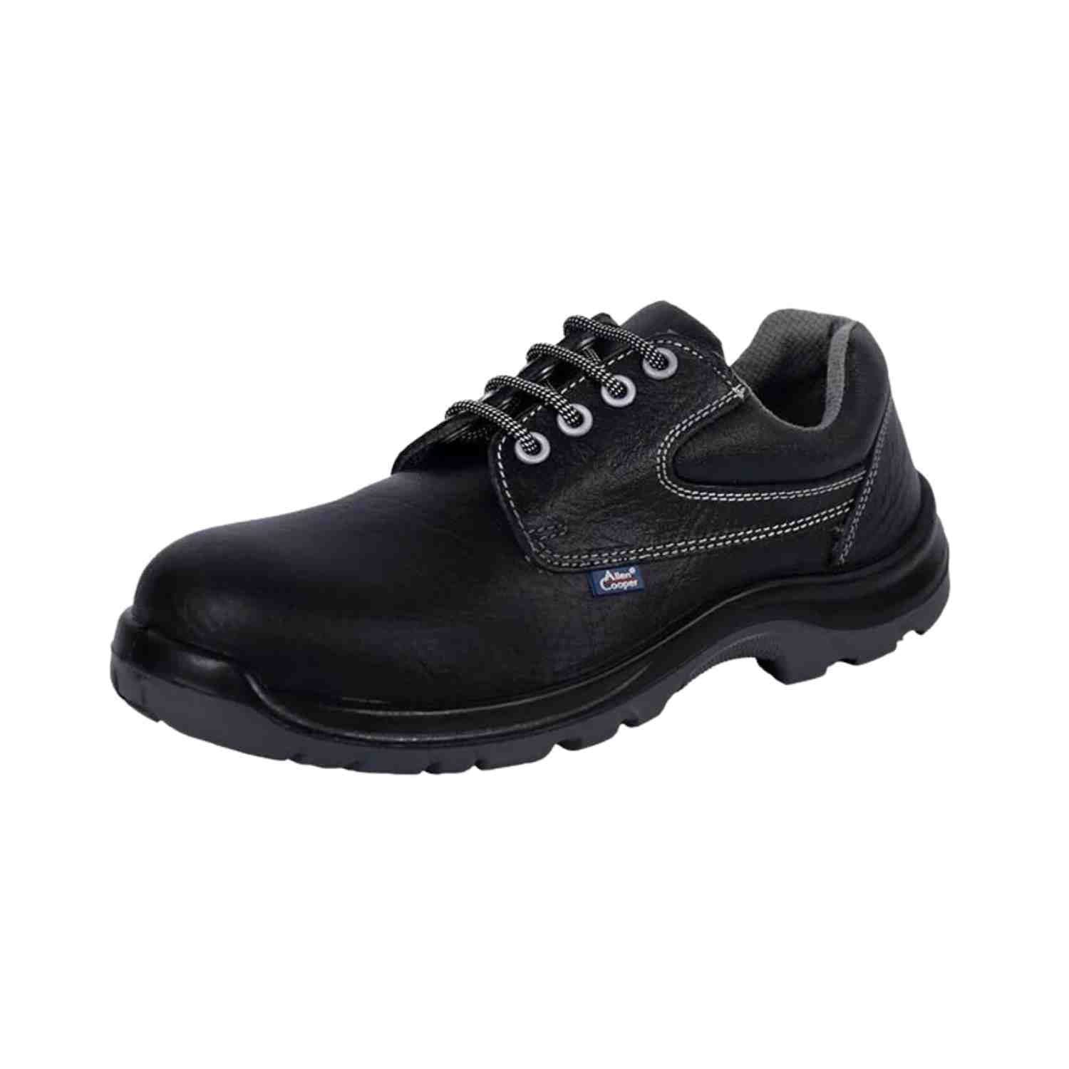 The Allencooper AC 1265 features a sleek black design crafted from premium materials, emphasizing both durability and aesthetic appeal. It incorporates a shock-resistant FRP (Fiber Reinforced Plastic) toe cap capable of withstanding up to 200 Joules of impact, providing robust protection against hazards commonly found in industrial settings.