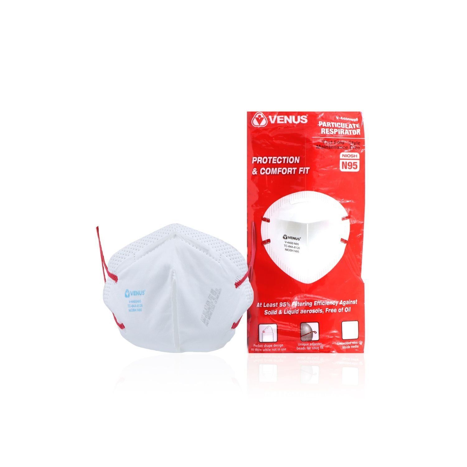 - VENUS V-Shwas V-4400 N95 Respirator (Face mask) approved by NIOSH with filtering efficiency – > 95% Protection: Non-oil based particles, Protects from respirable suspended particulate matter. NIOSH Approved Certificate TC-84A-8126.